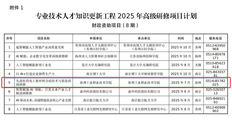 近日,江苏省人力资源和社会保障厅发布了《关于印发专业技术人才知识更新工程2025年省级高级研修项目的通知》,我校申报的《先进医药化工新材料合成技术与装备高级研修》项目成功入选。本次共有8家单位获批该项目,我校是全省高职校中唯一入选单位。
