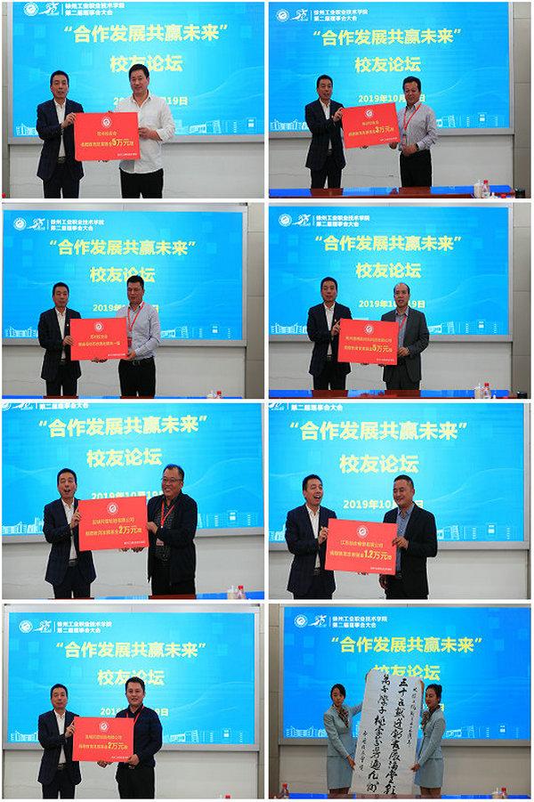 会上,学校分别与鼓楼区人民政府、邳州市人民政府签订了全面战略合作协议;并接受了深度合作企业徐工消防安全装备有限公司、徐州徐轮橡胶有限公司、江苏万邦生化医药集团有限责任公司、徐州中煤汉泰建筑工业化有限公司、江苏诚意集团、连云港石化有限公司等6家单位共计315万元的资金和设备捐赠。